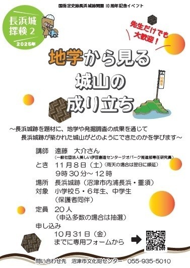 国指定史跡である伊豆長浜城跡。戦国時代の水軍の城として築城されましたが、伊豆半島でも有数のジオスポットでもあります。 今回の企画では、長浜城跡を舞台に、地学や発掘調査の成果を通じて長浜城跡が築かれた城山がどのようにできたのかを学びます。 参加費は無料。気軽に参加ください!