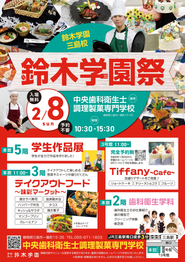 鈴木学園三島校の学園祭を開催します。 調理製菓総合学科の学生が心を込めて制作した作品展示や、惣菜・スイーツのテイクアウト販売、歯科衛生学科の体験コーナーなど、見て・食べて・体験できる内容が盛りだくさんです。 入場無料・予約不要。ご家族やご友人とぜひお越しください。※一部企画は事前予約制となります。