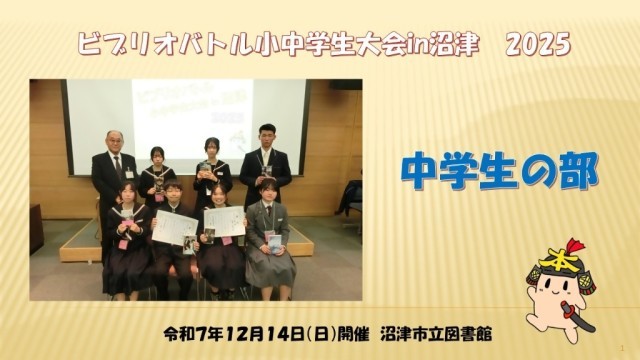 令和7年12月14日(日)に開催しました沼津市内の小中学生による書評合戦「ビブリオバトル小中学生大会 in 沼津 2025」決勝大会で、見事チャンプ本(優勝)と準チャンプ本(準優勝)に輝いた小中学生の発表を、沼津市公式YouTubeで公開しました。 どの本も読んでみたくなる魅力的な紹介となっています。ぜひご覧ください!
