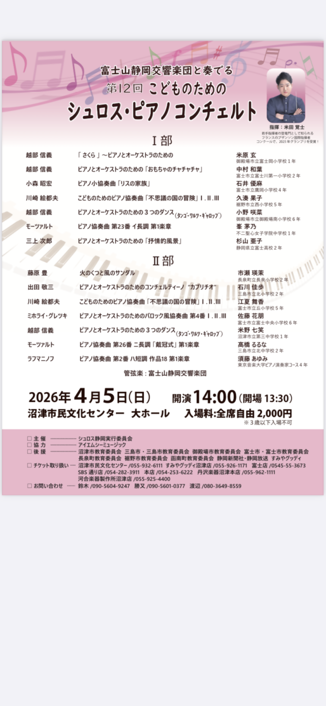 プロオーケストラと子どもたちが共演する、今年で12回目を迎えるコンチェルト公演です。 指揮には、2025年ブザンソン国際指揮者コンクールグランプリ受賞の実績を持つ米田覚士氏を迎え、富士山静岡交響楽団の豊かな響きに包まれながら、小さなピアニストたちが演奏します。 ご家族そろって、子どもたちの輝く音色をぜひ会場でお楽しみください。