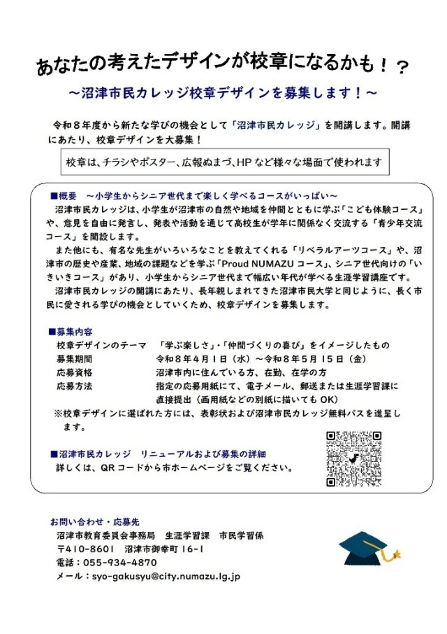 令和8年度から新たな学びの機会として「沼津市民カレッジ」を開講します。開講にあたり、校章デザインを大募集!あなたの考えたデザインが校章になるかも!?校章は、チラシやポスター、広報ぬまづ、HPなど様々な場面で使われます。年齢、プロ・アマは問いません!詳細は添付資料やホームページをご覧ください。