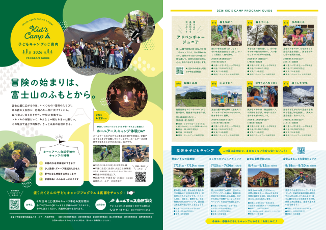■富士山の豊かな自然で好奇心と自立心を育む「ホールアース自然学校」から今年度のプログラムをお知らせします!■【主なラインナップ】1.アドベンチャージュニア(全7回/小1〜小6対象):4月「春を味わう」、5月「森をつくる」、6月「水のゆくえ」、9月「緑輝く高原」、10月「山よそおう」、11月「命をところなく頂く」、2月「凛とした空気」など四季を五感で体験します。2.夏休みキャンプ:7/18-19「里山いきもの探検隊」、7/25-26「はじめてのジュニアキャンプ」、8/4-12「富士山冒険学校2026(海抜0mから山頂3776mへ!)」、8/18-20「富士山まるごと大冒険キャンプ」など。■【キャンプの特徴】プロの指導による本格体験/少人数制/子どもの「夢中」を尊重/家畜動物とのふれあい。■【体験DAYのご案内】まずは体験したい方へ!4/29(祝・水)に火おこし体験等ができる「体験DAY」を開催します。■【お申し込み】夏休みキャンプは4/25(土)受付開始!先着順です。詳細は公式サイト( https://www.wens.gr.jp )をご覧いただくか、電話( 0544-66-0152 )までお問い合わせください。■【主催】NPO法人ホールアース自然学校(富士宮市下柚野165)■この夏、富士山のふもとで、まだ知らない自分に出会いに行こう!皆様のご参加をお待ちしております!