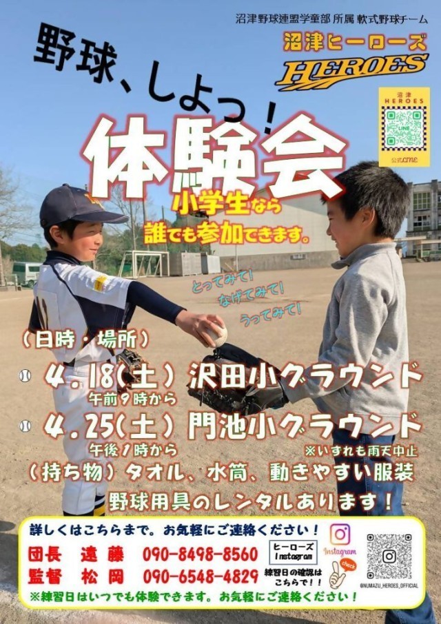 沼津ヒーローズ 野球体験会の参加者募集!(小学生対象)