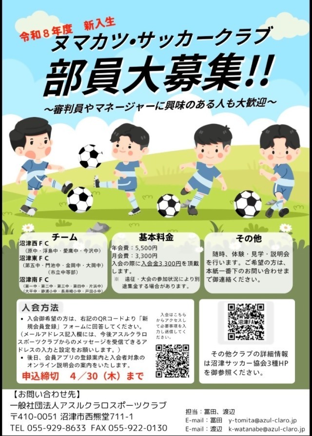 ヌマカツサッカークラブでは、令和8年度の新入生を募集しております。 サッカーの技術向上はもちろん、仲間との協力や思いやり、挑戦する気持ちを大切にしながら活動しています。初めてサッカーをするお子様でも安心して参加できる環境を整えております。 現在、無料体験を随時受付中です。 実際の練習にご参加いただき、クラブの雰囲気をぜひご体感ください。 詳細につきましては、チラシ記載の内容をご確認のうえ、お気軽にお問い合わせください。 皆さまのご参加を心よりお待ちしております。