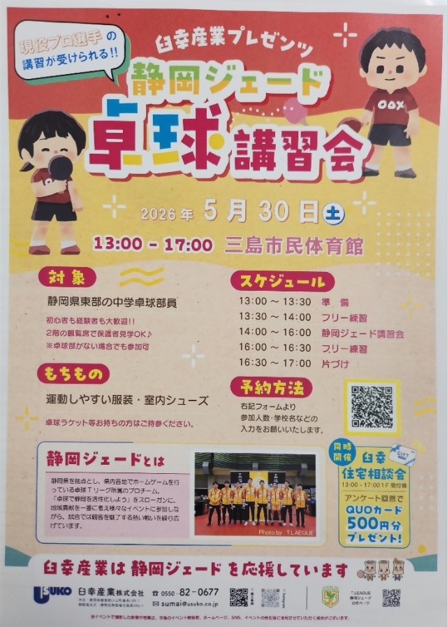 この度は弊社がスポンサーとなっております卓球プロチーム『静岡ジェード』のプロの選手に中学生向けの卓球教室を5月30日㈯13:00~三島市民体育館にて行う事になりましたのでご案内致します。参加費は無料になりますので是非ご参加ください。