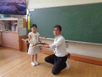 校長からクロームブックを大切に、そして安全につかってほしいというお話をした後、代表の児童に渡しました。