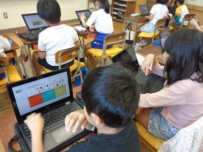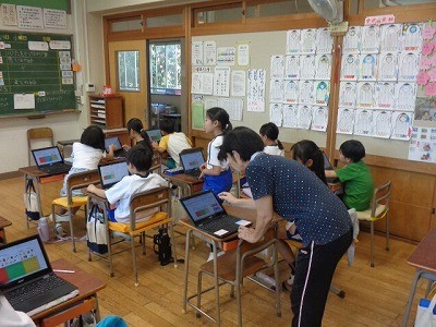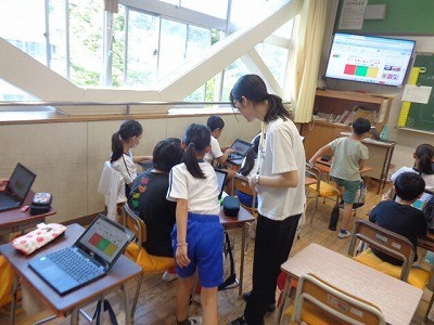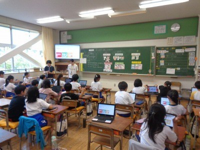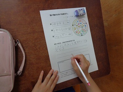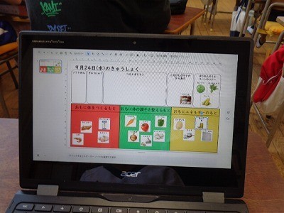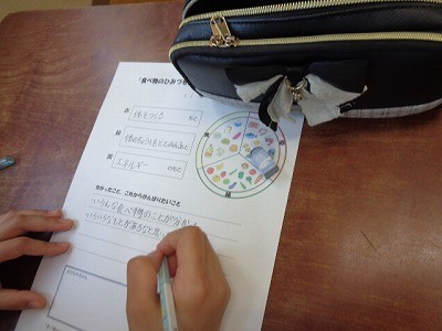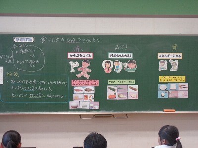給食の先生が授業を行っていました。3つの栄養について勉強した後、今日の給食のメニューはどんな栄養に分かれているのか、考えていました。