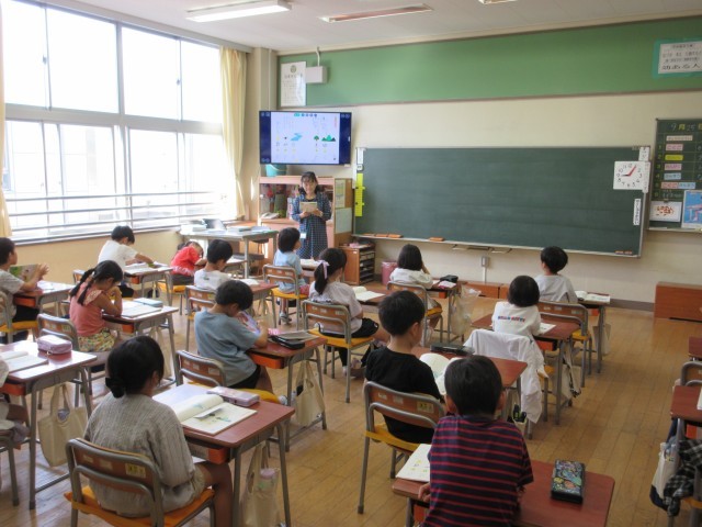 漢字のなりたちについて、教科書を読んで確認していました。順番に音読しています。1年生も落ち着いて学習しています。