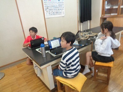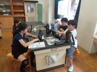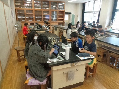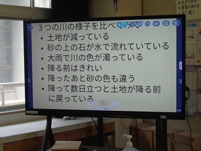同じ川の、雨の前と雨の降った後の状態を比べて、どんな変化があるか、お互いに意見交換をしています。
