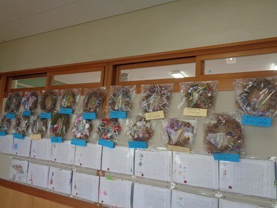 アサガオのツルで作った、リースが廊下に飾られています。