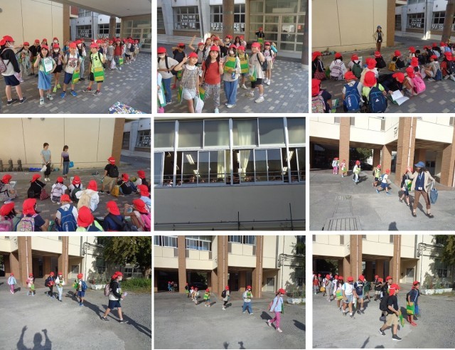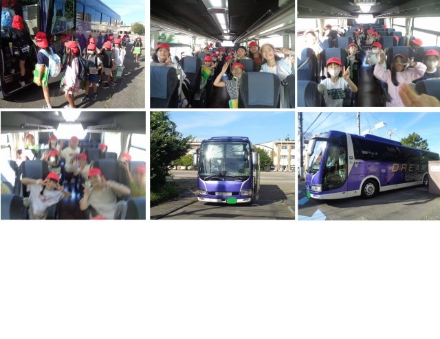 4年生は、社会科見学です.狩野川放水路や狩野川資料館へ向けて出発しました。1年生が見守る中、出かけていきました。