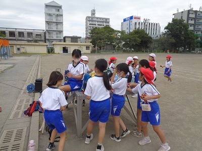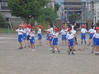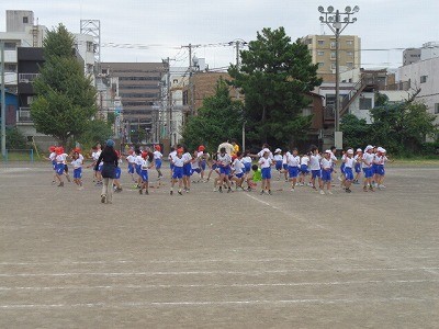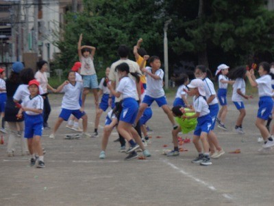 3・4年生の合同体育です。はばたき祭で行う、「よっちょれ」の練習を行っています。今日はグラウンドでの位置確認をしたあと。全体で踊っていました。