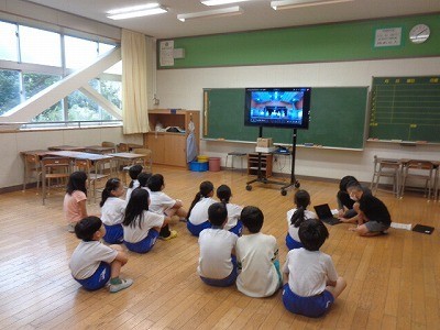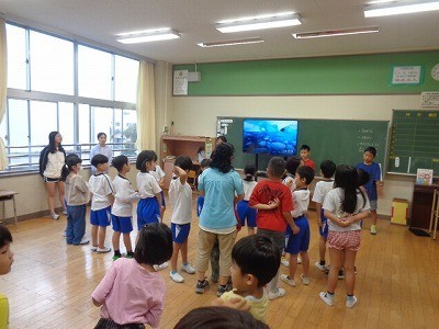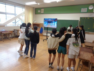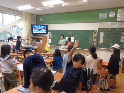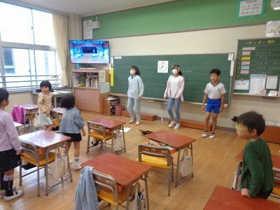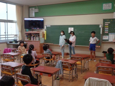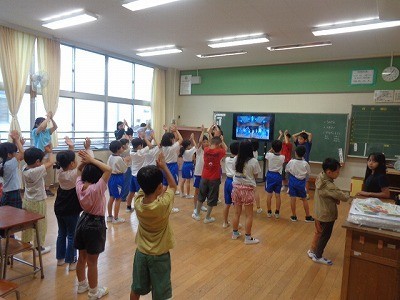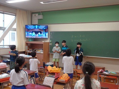 朝、5・6年生の応援団が中心となって、1年生から4年生・5組の応援練習を行っています。