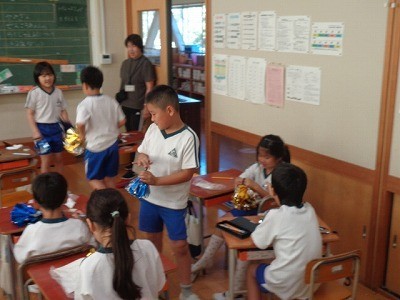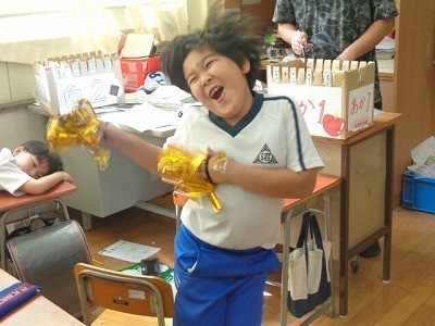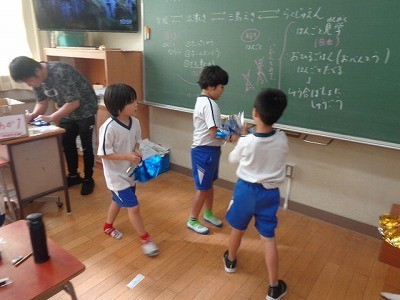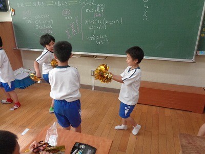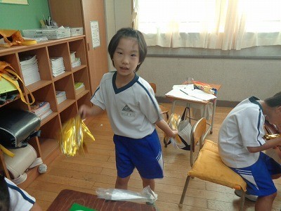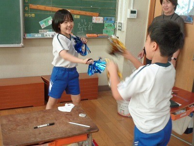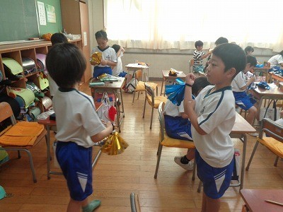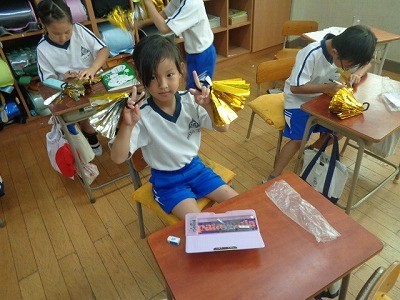 はばたき祭のダンスでつかうボンボンをつくっています。作った後、楽しそうに踊っていました。