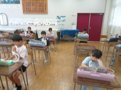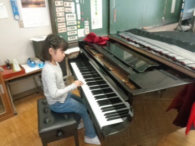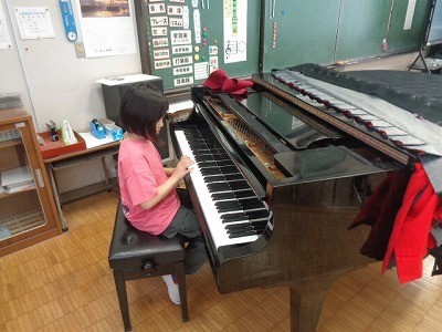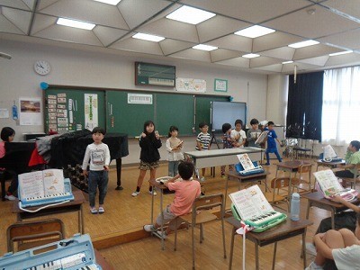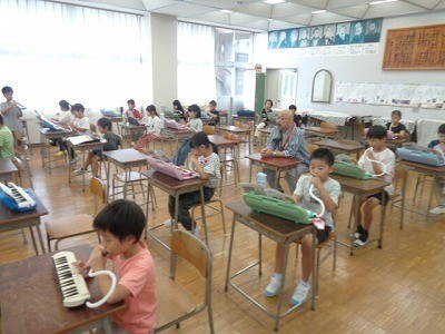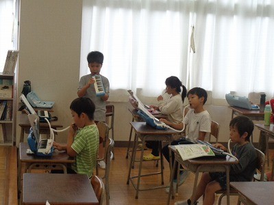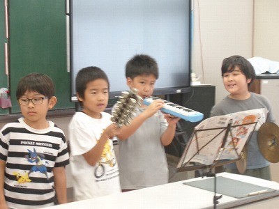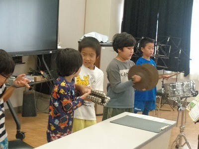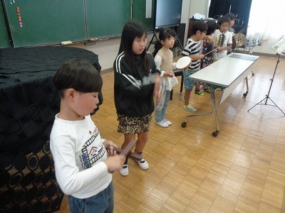 けんばんハーモニカと一緒に、打楽器をつかって、リズムをとっています。