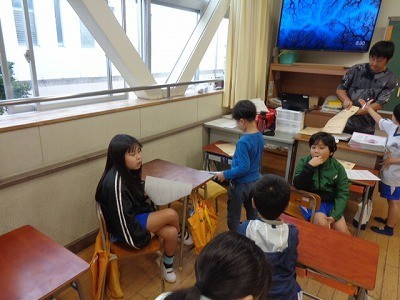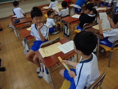 保護者にわたす、大切な書類を配布し、連絡封筒に入れています。