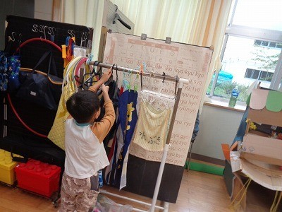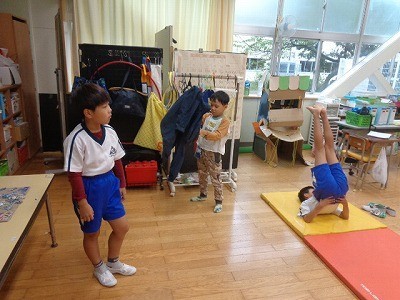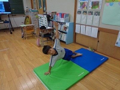 5年生は、音楽に合わせて組み体操の練習、2年生は身支度を行っていました。