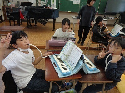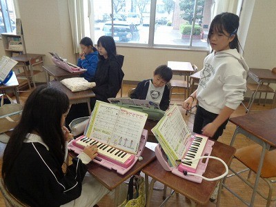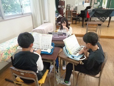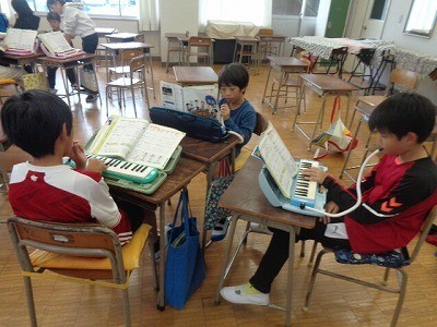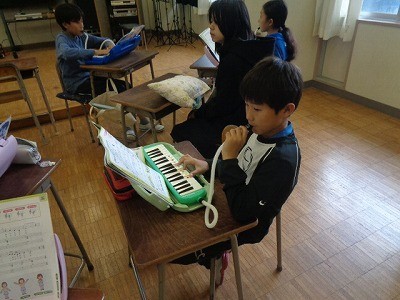 けんばんハーモニカで、「静かにねむれ」という曲を演奏しています。