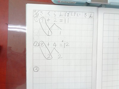 くりあがりのあるたしざんのけいさんほうほうを、考えています。