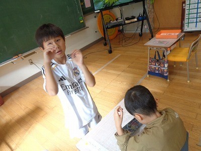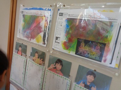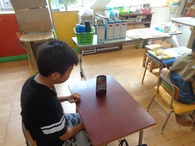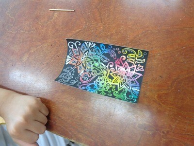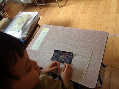 削ると色が浮き出てくる紙を、一生懸命削っています。