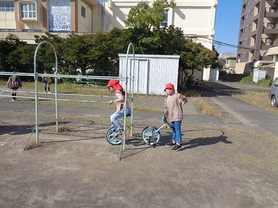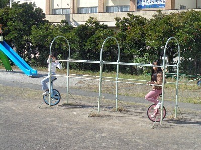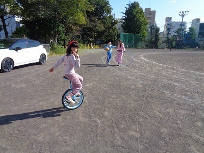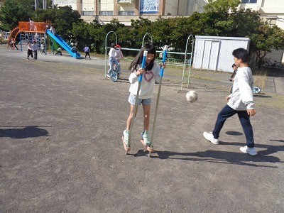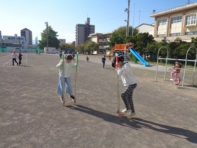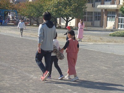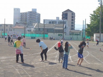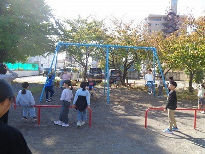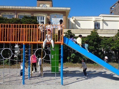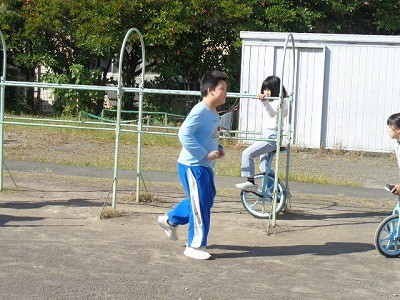 サンタイムのようすです。はばたき祭が終わったため、みんなグラウンドで遊んでいます。日射しも温かく、心地よい気候です。