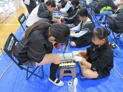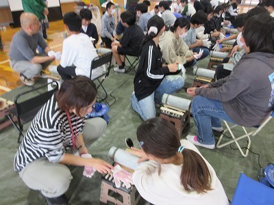 「竹ピカプロジェクト」とは、まちづくり・研修委員会さんが中心となって、沼津の町を盛り上げようという企画です。2人1組になって、竹に電動ドリルで穴を空けています。