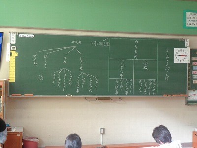 「のりもの」→「ふね」「じどうしゃ」→… など、まとめてよぶことばについて、どんなことばがあるかさがしていました。