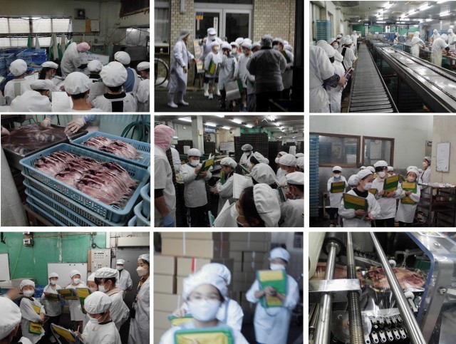始めにひもの工場へいきました。魚をさばいたり、ラッピングしている様子を観察しました。