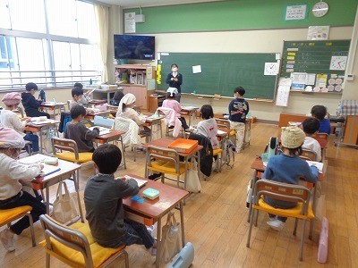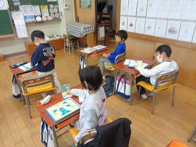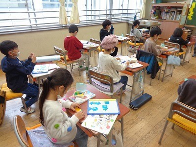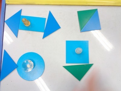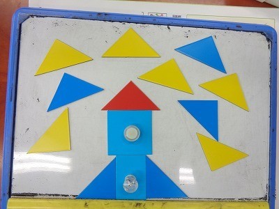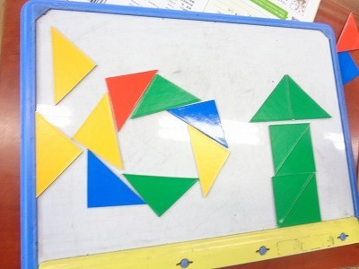 三角形、四角形、丸など、いろいろな図形をつかって、模様を作っています。