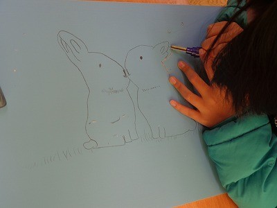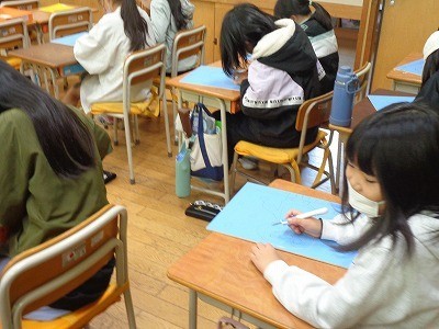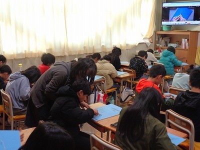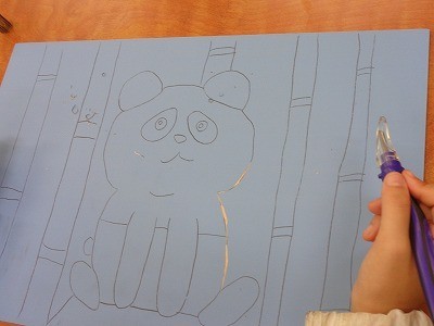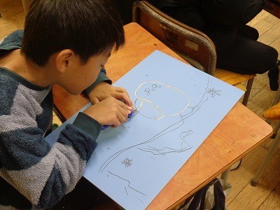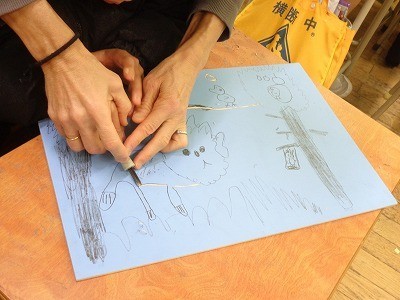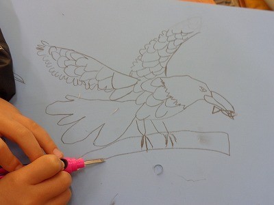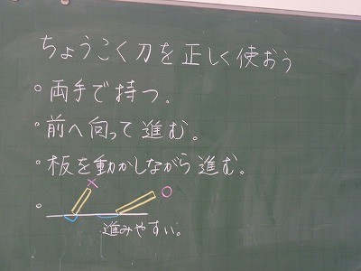 彫刻刀をつかって、彫っています。安全に注意しながら作業していました。