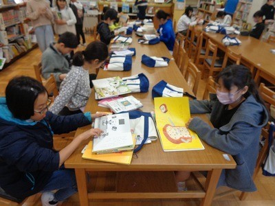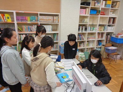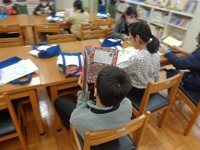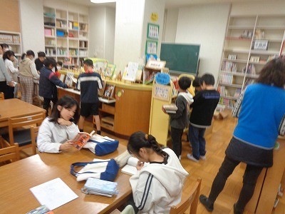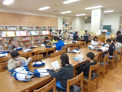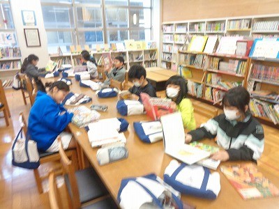 図書館で本を借りています。借りた後は、集中して読書をしています。