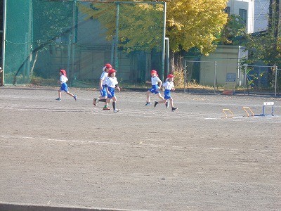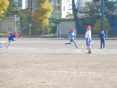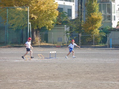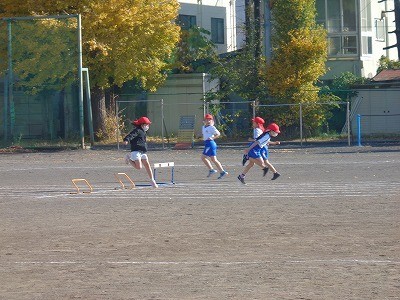 グランドで、長縄跳び、ハードル走、サッカーなどを行っていました。