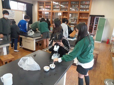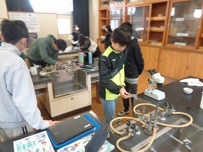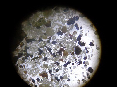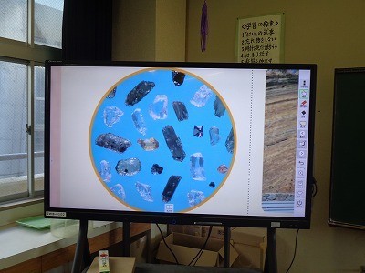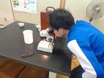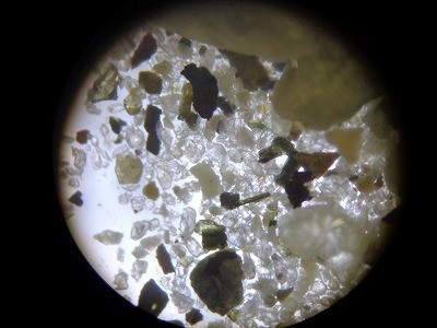 農業などに使われている、鹿沼土(かぬまつち)を細かく砕いて、洗い、双眼実体顕微鏡で調べています。鹿沼土は軽石で、火山から噴出したものです。きれいな鉱物をたくさん見ることができました。