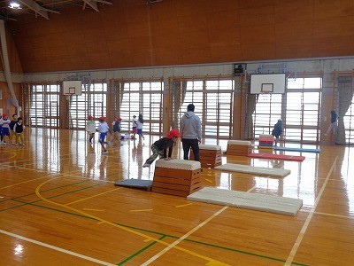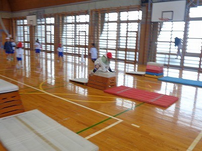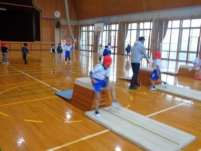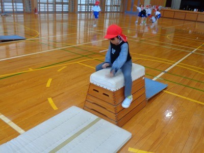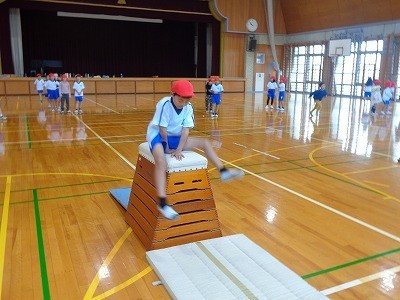 とびばこを行っています。いろいろな高さのとびばこを用意し、自分の飛べる高さに挑戦しています。