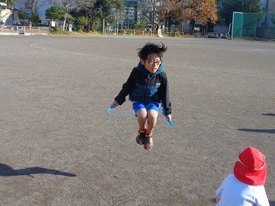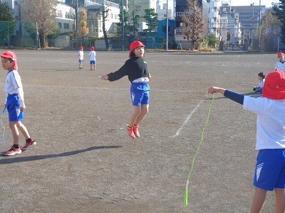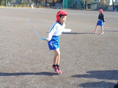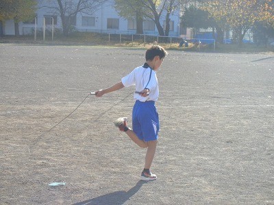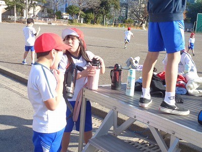 グラウンドで、はしったり、なわとびをしたりしています。定期的に水分補給も行っています。