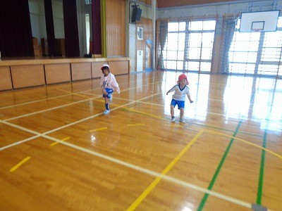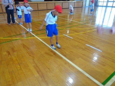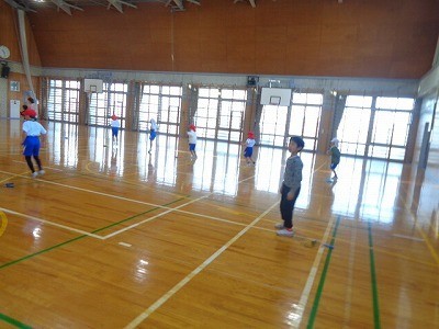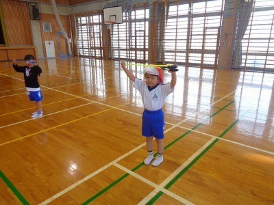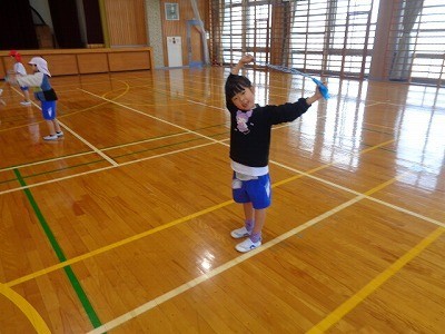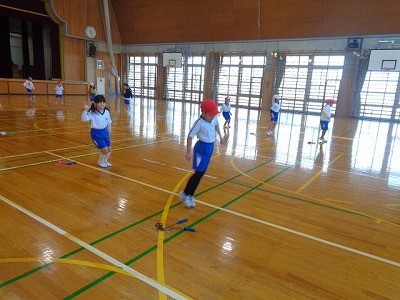 準備運動です。なわとびを使いながら、体を動かしていき、このあとのなわとび運動のために体を温めていました。