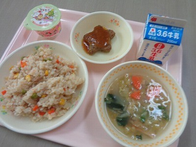 今日は、「クリスマス献立」です。主菜は、星型ハンバーグにしました。ソースには、タマネギやリンゴを入れて、バーベキュー味にしました。ハムとたっぷりの野菜を使いました。デザートはイチゴプリンです。ホイップクリームで飾り付けしてあります。