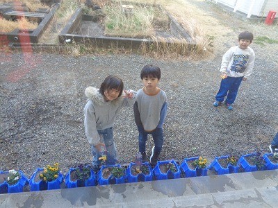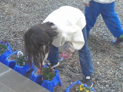 休み時間に、チューリップやビオラの鉢植えに水をあげています。
