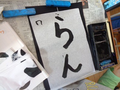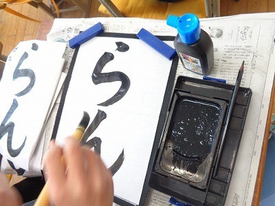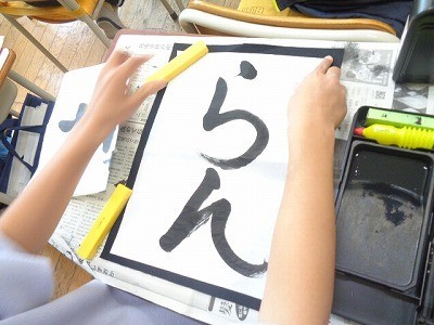 「らん」という字を書いています。曲線に特に気を配りながら、心を込めて書いていました。