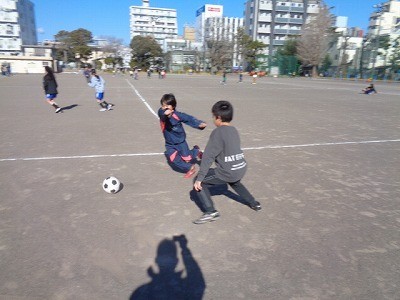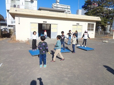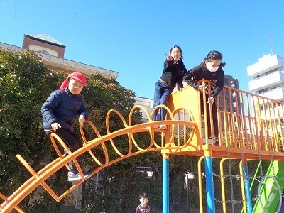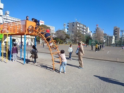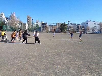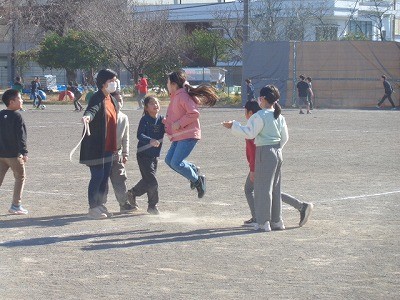 昼休みのようすです。みんなグラウンドで、元気よく遊んでいます。今日は風もなく、清々と遊んでいます。