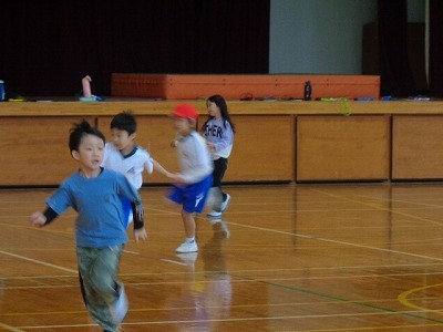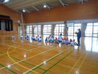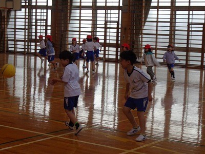 ボールの当てっこをしています。ルールをきめて、それを守りながら行っています。