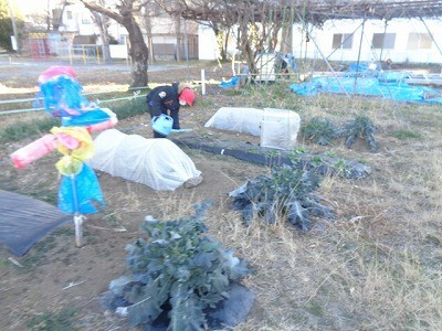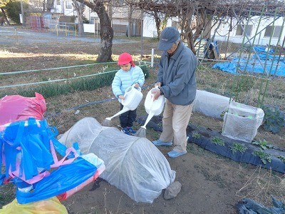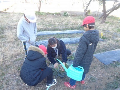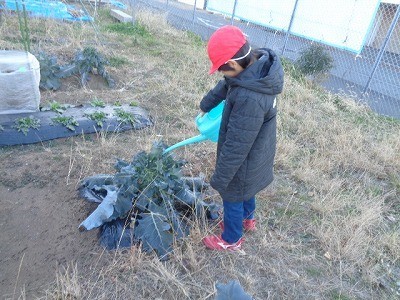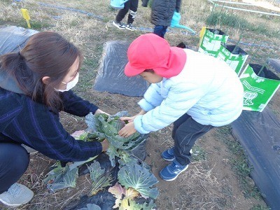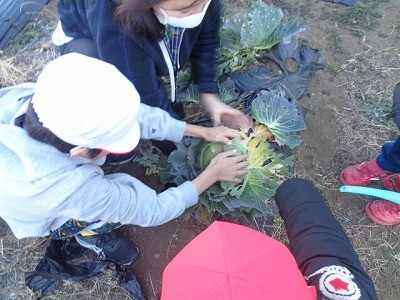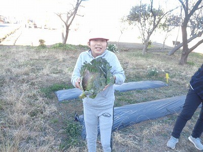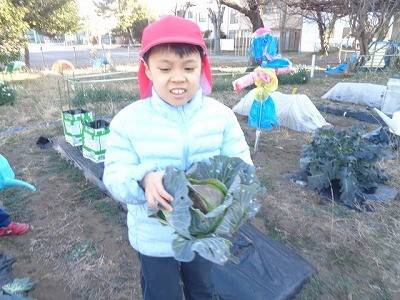 畑の野菜に水をあげたり、キャベツの収穫をしたりしました。