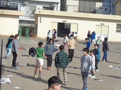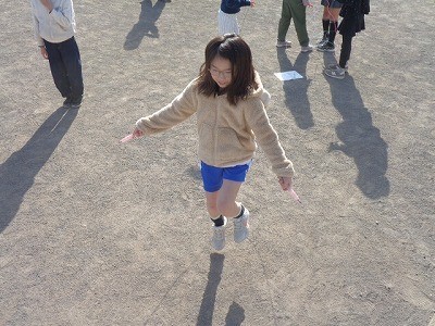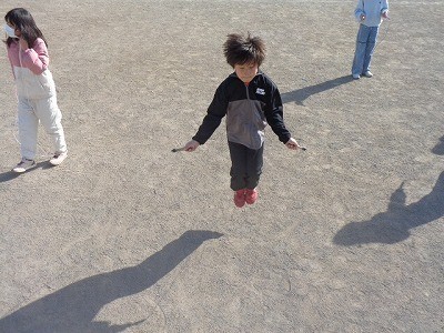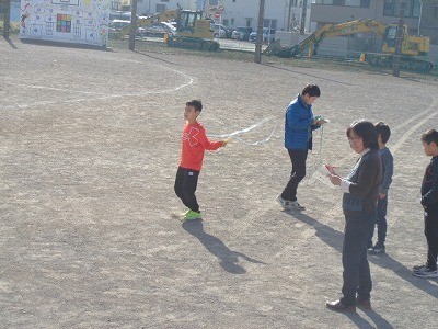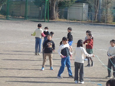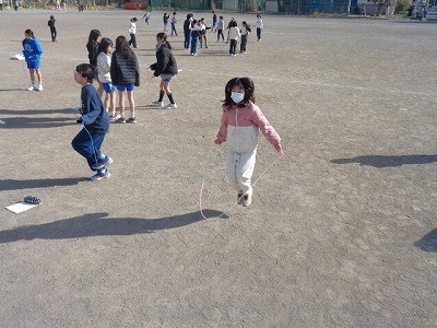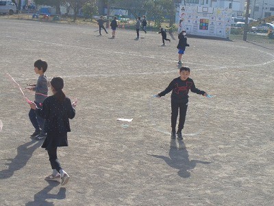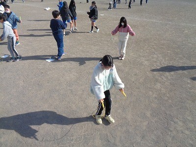 なわとび運動です。みんな自分の目標に向かってチャレンジしています。風もなく、とてもいい天気です。