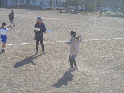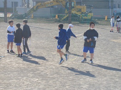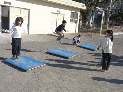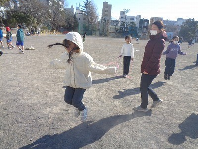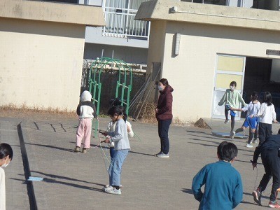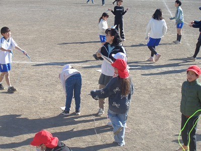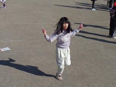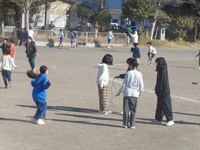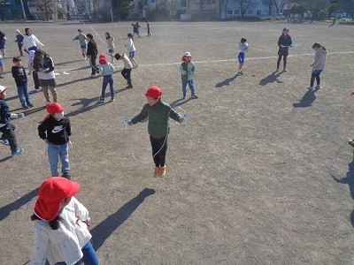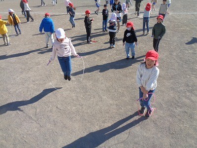 サンタイムのようすです。みんなでなわとび運動を行っています。