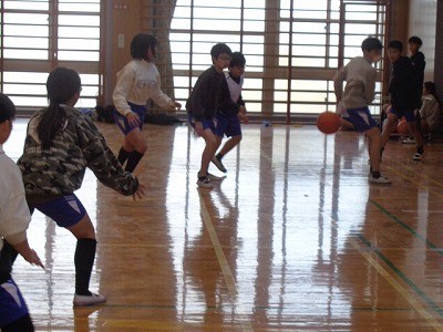 1・2組で合同体育を行っています。グループに分かれて、バスケットボールを行っていました。