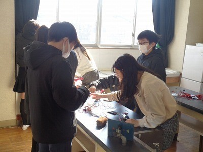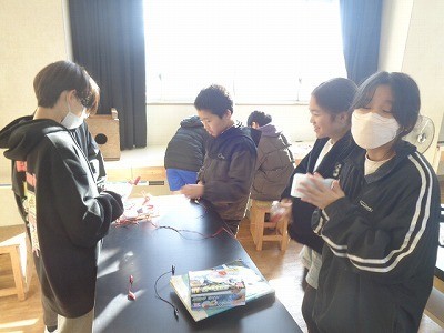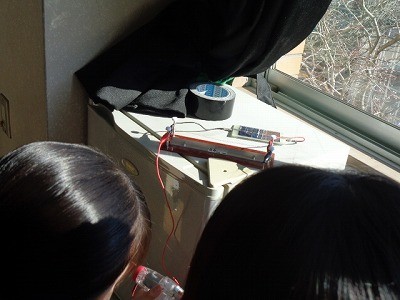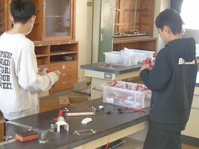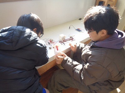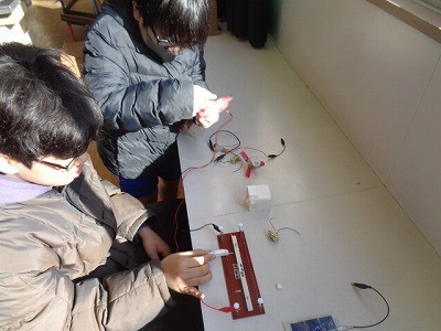 手回し発電機でプロペラをまわしたり、発泡スチロールを切ったり、太陽電池で明かりを付けたり、いろいろな実験を行っていました。
