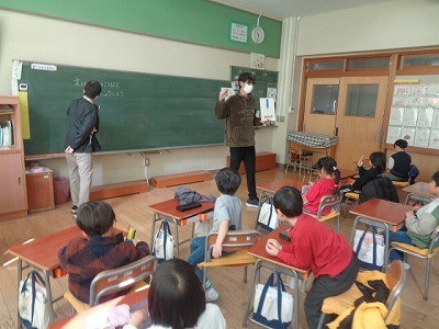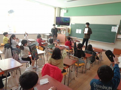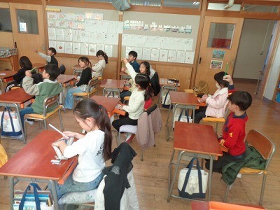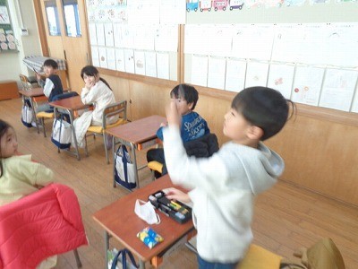 身の回りの文房具を、英語で何というのか、色と合わせながら確認しています。