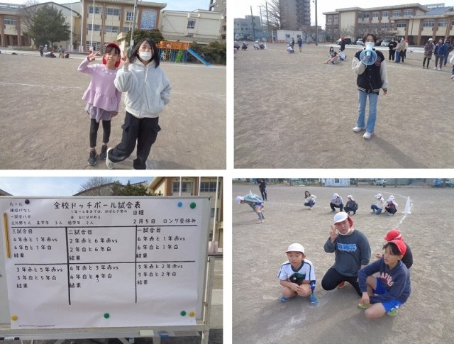 昼休みに、計画委員さんの企画で、全校ドッジボール大会を行いました。事前に準備、進行など計画委員さんたちが、第一小の今の仲間と過ごすことができるのはあとわずかであることを考えて、みんなで行いました。