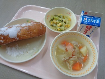 今日は、「「あげパン」について紹介します。日本のあげパンは、今から75年前に東京の小学校の給食担当の篠原さんが休んだ児童に家に届けるパンをおいしく食べてもらうために作った物です。夏場の暑いときは、砂糖が溶けてしまうので、1年間で作れるときが決まってしまい、多く出ません。作るのは大変ですが、味わって食べてもらえるとうれしいです。