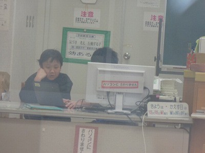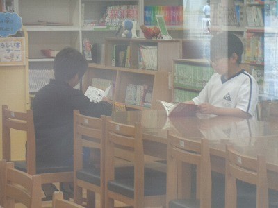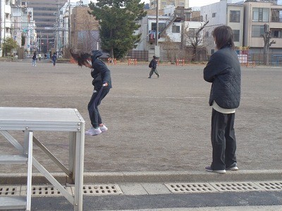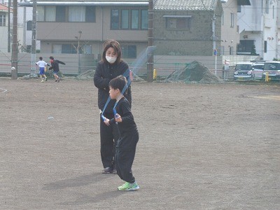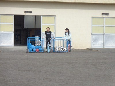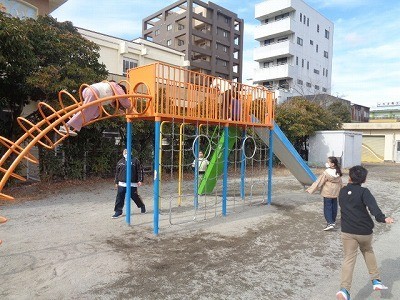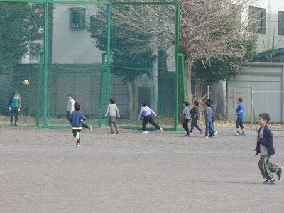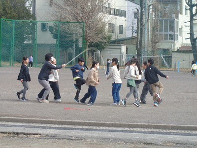 昼休みのようすです。グラウンドでは、あたたかい晴天のもと、友達と楽しそうに遊んでいます。